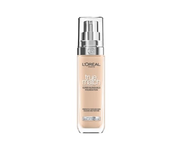 The L’Oréal Paris True Match Super-Blendable Foundation is a lightweight, medium-coverage foundation designed to seamlessly match your skin tone and undertone for a natural, skin-like finish. Its hydrating, non-comedogenic, fragrance-free formula is enriched with ingredients like glycerin, vitamin E, and SPF 17, making it suitable for all skin types, including sensitive skin. Known for its smooth texture and effortless blendability, it evens out the complexion without feeling heavy or cakey. The foundation is available in an impressive range of 47 shades, offering precise matches across warm, cool, and neutral undertones. While it typically wears well for 6–8 hours, setting it with powder can enhance longevity and minimize creasing. Overall, it's a trusted drugstore staple that delivers comfort, coverage, and a natural finish at an affordable price.