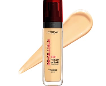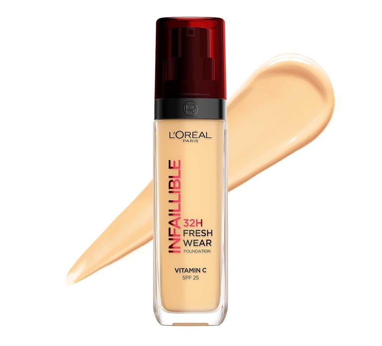 The L’Oréal Paris Infallible 24H Fresh Wear Foundation is a lightweight, breathable foundation that offers buildable medium to full coverage with a natural, satin-matte finish. Designed for long wear, it claims up to 24 hours of staying power while remaining comfortable on the skin. The formula is sweat-resistant, transfer-proof, non-comedogenic, and enriched with SPF 25, making it a reliable option for daily wear and warm climates. It blends smoothly and provides a smooth, even complexion without looking cakey. While it performs well on normal, combination, and oily skin types, some users with dry or sensitive skin may find it slightly drying or reactive due to its fragrance and alcohol content. It comes in an extensive shade range globally, though availability can vary by region. Overall, it’s a dependable, affordable drugstore foundation known for its long-lasting wear and natural, skin-like finish.