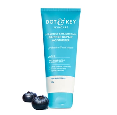 Dot & Key Barrier Repair Moisturizer is a gentle, hydrating cream formulated to strengthen and restore the skin’s natural barrier while providing lasting moisture. Enriched with 5 essential ceramides, hyaluronic acid, Japanese rice water, and probiotics, it helps lock in hydration, soothe redness, and support a healthy skin microbiome. Its rich yet non-greasy texture absorbs easily, leaving the skin soft, plump, and balanced. Fragrance-free and dermatologically tested, this moisturizer is suitable for normal, dry, combination, and sensitive skin types, making it ideal for daily use to repair and protect compromised skin.